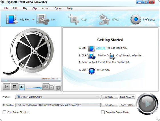 Bigasoft Total Video Converter - мощный видеоконвертер, позволяющий конвертировать практически любые видеофайлы в различные форматы. Программа распознает свыше 40 видео и аудио форматов и поддерживает конвертирование между свыше 30 форматами (AVI, Xvid, DivX, H.264, MP4, 3GP, MKV, WMV, RM, FLV, MOV, WebM, VP8, 720p, 1080p, 1080i HD, AVCHD видео и многими другими). Также программа имеет встроенный мощный алгоритм преобразования медиафайлов благодаря которому можно конвертировать их с очень высокой скоростью. Это также и мощный аудиоконвертер, способный конвертировать между MP3, AAC, AC3, WAV, WMA, и т. д. Кроме того, он может извлекать аудио из видео. Поддерживает конвертирование видео для большинства цифровых устройств, включая IPod, iPhone, BlackBerry, Apple TV, Zune, PSP, PS3, Pocket PC, Creative Zen, Xbox, Archos и других.