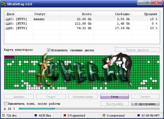 UltraDefrag - программа для быстрой дефрагментации диска (дефрагментация производится в режиме ядра). Имеет три интерфейса: графический, собственный и консольный.