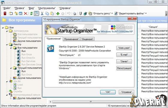 Startup Organizer предоставляет быстрый доступ ко всем программам, которые автоматически загружаются вначале работы за компьютером. Используя Startup Organizer, вы можете посмотреть, изменить или временно отключить автозапуск таких программ, или сделать резервную копию конфигурации автозагрузки. Вы можете существенно увеличить скорость загрузки вашей системы, если отключите запуск программ, в которых больше не нуждаетесь.