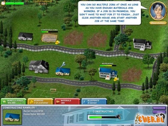 В этой игре вам предстоит сиграть не в качестве рядового строителя, а в роли начальника строительной фирмы, обустраивающей целые городки. Игра носит не тактический, а стратегический характер. По совместительству с основным занятием вам придется поработать риэлтором, так как на игровом поле присутствуют не только ваши дома, но и здания и земельные участки других владельцев.