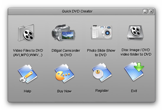 Quick DVD Creator - программное обеспечения для копирования, преобразования и создания DVD-фильмов. Позволяет конвертировать видеофайлы в формат DVD, создавать DVD-видео слайд-шоу с использованием цифровых фотографий и собственной фоновой музыки, оцифровывать видео с цифровых видеокамер в формат видео-DVD с возможностью записи на DVD-R, DVD-RW, DVD+R или DVD+RW диски или сохранения в формате ISO.