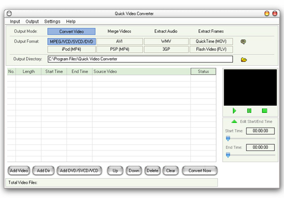 Quick Video Converter - конвертор, позволяющий преобразовывать видеофайлы из одного формата в другой, вырезать части из видеофайлов, объединять несколько видеофайлов в один, производить риппинг полностью или частями с DVD/SVCD/VCD, извлекать аудио из видео в MP3, WAVE, WMA форматы, извлекать видеокадры в форматы BMP, JPEG, GIF, TIF, PNG. Поддерживает предпросмотр, и пакетное преобразование видеофайлов.