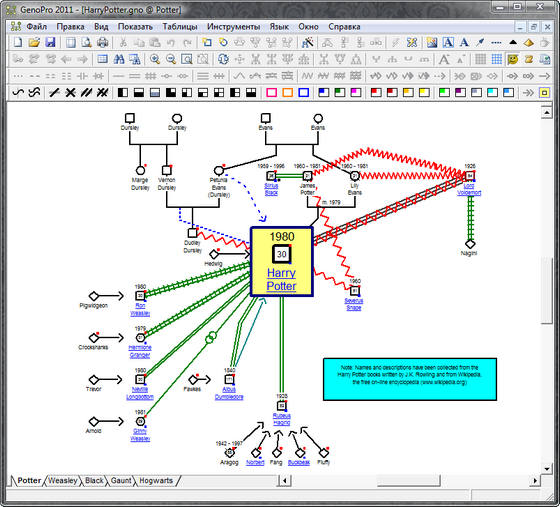 GenoPro - одна из самых популярных в мире генеалогических программ. Она используется генеалогами, врачами, работниками социальной сферы, учителями, а так же исследователями в этих областях. Построение генеалогических деревьев выполняется с помощью мастеров. Имеется возможность включать фотографии, веб-ссылки, публиковать файл в Интернете.