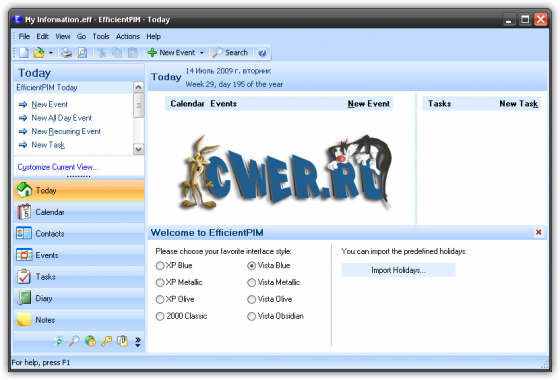 EfficientPIM - полнофункциональный Персональный Информационный Менеджер, который поможет вам организовать и спланировать вашу рабочую и личную жизнь. С помощью этой программы можно отслеживать контакты, встречи, задачи, дни рождения, хранить заметки, вести дневники и даже хранить пароли с помощью встроенного менеджера паролей. Для того, чтобы стать успешным предпринимателем или просто человеком - нужно быть организованным и эффективным, в чем вам и поможет данная программа. Программой поддерживается создание нескольких независимых профилей для каждого пользователя, а также выбор индивидуального интерфейса.