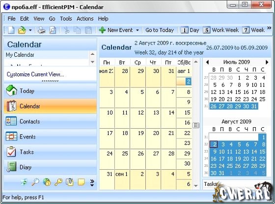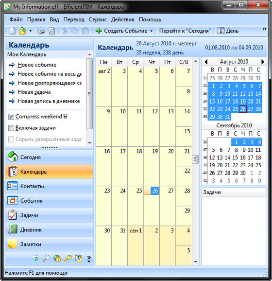 EfficientPIM - полнофункциональный персональный информационный менеджер, который поможет вам организовать и спланировать вашу рабочую и личную жизнь. С помощью этой программы можно отслеживать контакты, встречи, задачи, дни рождения, хранить заметки, вести дневники и даже хранить пароли с помощью встроенного менеджера паролей. Для того, чтобы стать успешным предпринимателем или просто человеком - нужно быть организованным и эффективным, в чем вам и поможет данная программа. Программой поддерживается создание нескольких независимых профилей для каждого пользователя, а также выбор индивидуального интерфейса.