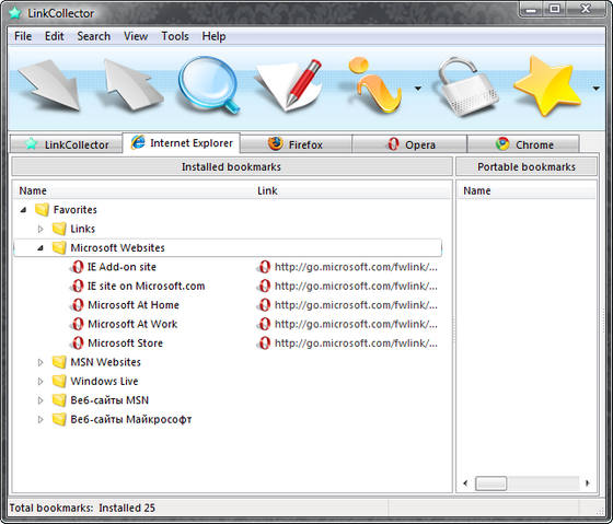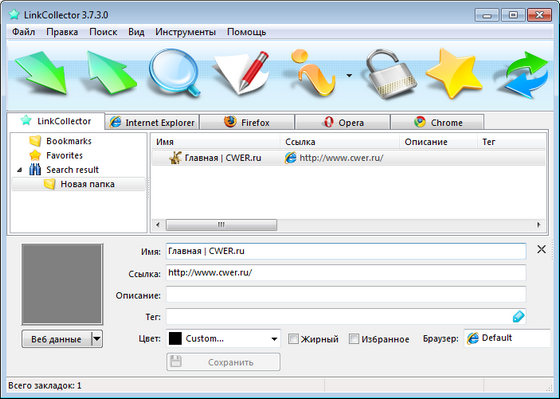 LinkCollector - менеджер закладок, поддерживающий все наиболее популярные браузеры, такие как Firefox, Opera, IExplorer. Программа позволяет синхронизировать закладки между разными браузерами и компьютерами, может быть размещена на USB-диске а также не записывает никаких файлов в системные папки и не записывает никакие данные в реестр Windows. Приятный, интуитивно понятный интерфейс позволит быстро выполнить нужную операцию над закладками. LinkCollector Portable Edition позволяет добавить, удалять и редактировать закладки, искать дубликаты, проверить ссылки на существование, удалить не существующие, быстро открыть ссылку в разных браузерах (Firefox, Opera, IExplorer, Mozilla, Netscape), а также захватить ссылку из браузера с которым Вы в данный момент работаете.