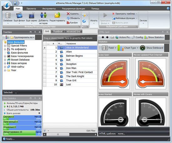 eXtreme Movie Manager - лучшая программа для ведения домашней фильмотеки. Для каждого фильма предоставлено более 70 (!) полей описания, разделенных по подгруппам. Возможность импорта данных со специализированных сайтов, есть возможность создания собственного импорт-скрипта. Программа поддерживает все существующие сегодня форматы файлов от *.avi и *.mpg до RealMedia. При помощи программы можно не только вести учет коллекции, но и воспроизводить видеофайлы. Программа имеет возможность сканировать диск на наличие имеющихся на винчестере мультимедийных файлов, разрешение которых вы укажете в настройках, и автоматически составляет из них каталог.