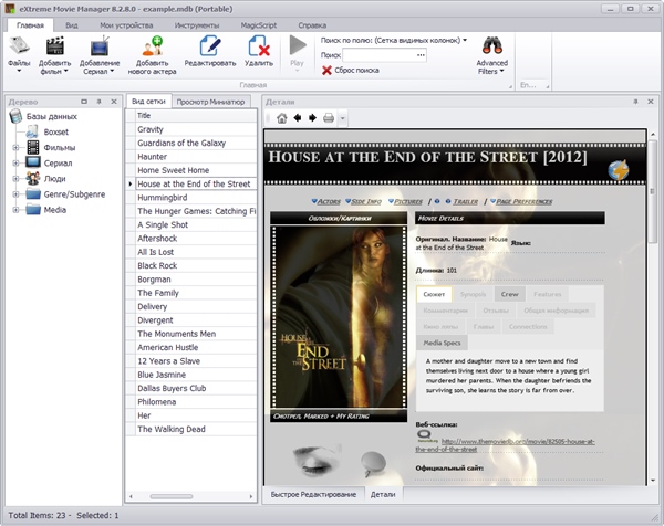 eXtreme Movie Manager - интеллектуальная разработка для ведения домашней фильмотеки. Для каждого фильма предоставлено более 70 полей описания, разделенных по подгруппам. Возможность импорта данных со специализированных сайтов, есть возможность создания собственного импорт-скрипта. Программа поддерживает все существующие сегодня форматы файлов от *.avi и *.mpg до RealMedia. При помощи программы можно не только вести учет коллекции, но и воспроизводить видеофайлы. Программа имеет возможность сканировать диск на наличие имеющихся на винчестере мультимедийных файлов, разрешение которых вы укажете в настройках, и автоматически составляет из них каталог.