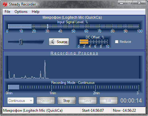 Steady Recorder - неплохая замена встроенному в Windows звуковому редактору. Позволяет записывать с любого источника и сохранять данные в MP3 или WAV форматы. Для контроля записи отображается звуковая форма волны и ее спектр в реальном времени. Имеется встроенный редактор.