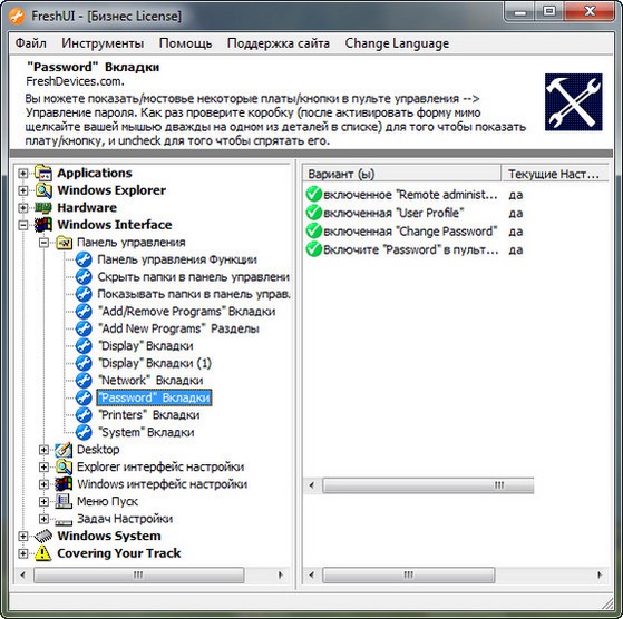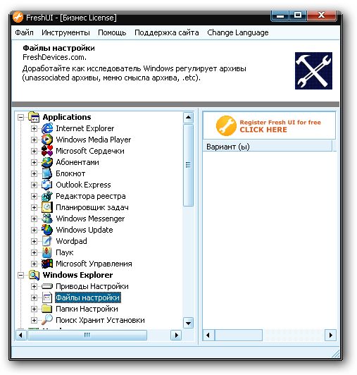 FreshUI - утилита, при помощи которой вы получите доступ к большому числу параметров операционных систем Windows, разбитым на несколько категорий — интерфейс, система, аппаратная часть, приложения (Windows) и пользователи (среда и правила). Включает сотни полезных, скрытых параметров настройки. Позволяет редактировать скрытые опции для стандартных программ (Windows Media Player, Outlook Express), может ограничивать доступ к различным частям операционной системы (панель управления, командная строка), редактировать контекстные меню проводника и т.д.
