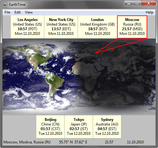 EarthTime - программа для показа локального времени и даты любого места земного шара. Программа имеет встроенную базу данных более 3000 городов Земли, а также позволяет пользователю добавлять любое количество собственных локаций. Позволяет устанавливать будильники на любое локальное время любого города нашей планеты. Множество опций в данной программе предоставляют пользователю гибкие настройки часовых поясов и локального времени.