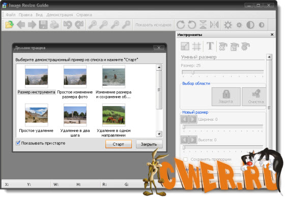 Image Resize Guide - программа для изменения размеров и пропорций фотографий без искажения важных частей и для удаления объектов без видимых следов. Программа содержит следующие инструменты изменения размера изображения и удаления объектов: Размер, Вырезать фрагмент, Умное удаление, Умный размер, Латание. В программу включены анимированные примеры обработки фотографий: простое изменение размера фото; изменение размера фото и сохранение объектов; простое удаление; удаление в два шага, удаление с защитой, латание, т е в программу включены анимированные демонстрационные примеры, которые по шагам объяснят как все это правильно сделать.