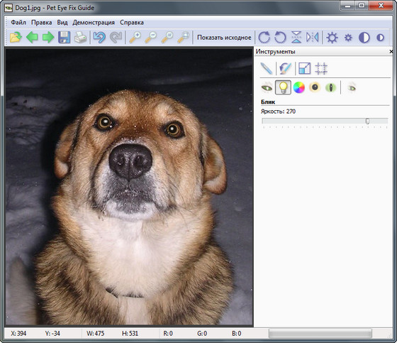Pet Eye Fix Guide - программа для устранения эффекта засвеченных глаз с фотографий домашних животных и людей. Позволяет восстановить даже полностью испорченные вспышкой глаза. Может справиться с засвеченными глазами любого цвета - красными, желтыми, зелеными, синими и даже полностью белыми. Победит засветку как в зрачке, так и на всем глазу. Программа реализована как самостоятельное приложение и как плагин к различным графическим редакторам.