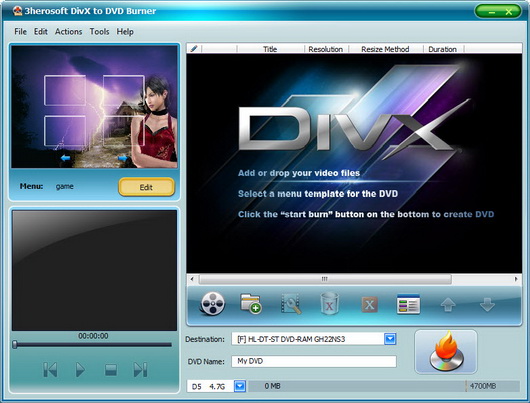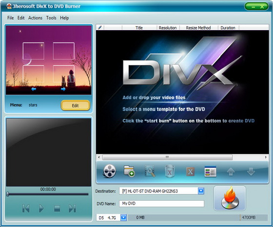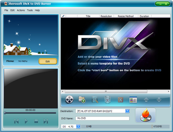 3herosoft DivX to DVD Burner - программа для создания видео Blu-Ray, DVD, CD, полноценных видео DVD проектов с прожигом (записью) на DVD носитель, создание видео DVD из DivX, XviD, AVI видео форматов, полноценных меню и субтитров, выбор из стандартных или собственная настройка параметров картинки, битрейда.