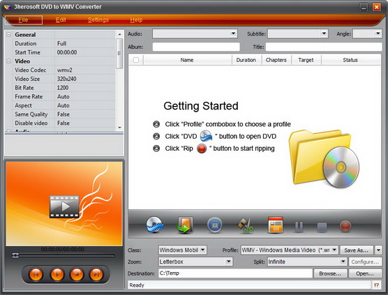 3herosoft DVD to WMV Converter - является мощным и простым в использовании конвертером, который может преобразовать DVD в WMV и извлекать из DVD, аудио в WMA с отличным качеством видео и аудио. Программа поддерживает, Windows Media Player, Google Phone, BlackBerry Storm, BlackBerry Bold, Palm Pre, Microsoft Zune, Microsoft Zune 2, PSP, PS3, Xbox 360, Dell Player, HP IPAQ, и другие. Кроме того, с помощью данного конвертера можно разделить файл на части, настроить частоту кадров, частоту дискретизации, разрешение, соотношение сторон и т.д.
