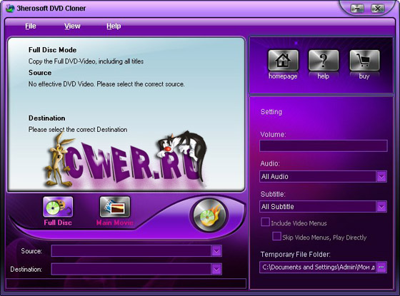 3herosoft DVD Cloner- программа для работы с dvd video, позволяет выполнять следующие операции с dvd дисками: копирование видео DVD дисков, копирование содержимого на жесткий диск, прожиг (запись) видео на DVD-R(W), DVD+R(W) носители, копирование DVD-5 и DVD-9 с записью на DVD-9 Dual Layer, сжатие видео с DVD-5, DVD-9 до размеров DVD-5, выбор файлов для копирования или извлечения, удаление ненужных файлов (субтитры, аудио и языковых файлов) с копированного на жесткий диск DVD, автоматическая подготовка проекта к записи на DVD, прожиг готового проекта на DVD болванку, копирование или обход защит от копирования (CSS(Content Scrambling System), region protected, Macrovision Protected, SONY ARCCOS protected).