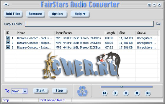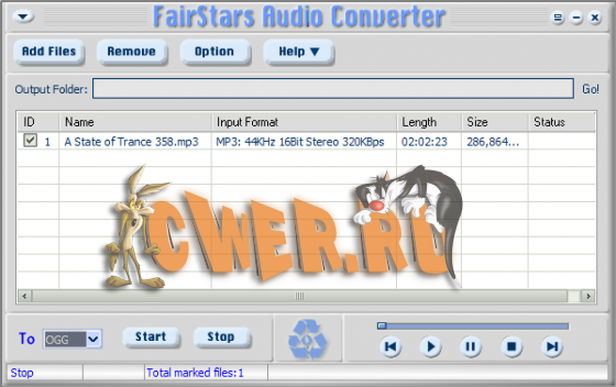 FairStars Audio Converter - является профессиональным инструментом для конвертации аудио файлов самых разнообразных форматов (WAV, APE, OGG, MP1, MP2, MP3, WMA, WMV, ASF в WMA, MP3, OGG, APE, WAV). Кроме конвертации утилита позволяет нормализовать композиции по звучанию, улучшить качество воспроизведения, имеет встроенный плеер и позволяет редактировать ID3 теги.