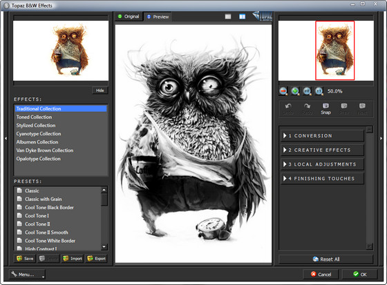 Topaz B&W Effects - плагин производства Topaz Labs, способный превратить Ваши цветные фотоснимки в ошеломляющие черно-белые композиции! Он содержит все существующие инструменты и эффекты, которые позволят создать сногсшибательные изображения гораздо легче, чем когда-либо ранее с помощью более чем 200 пресетов, имитирующих различные эффекты исторических фото, стилизованных и традиционных фотопроцессов и многое другое.