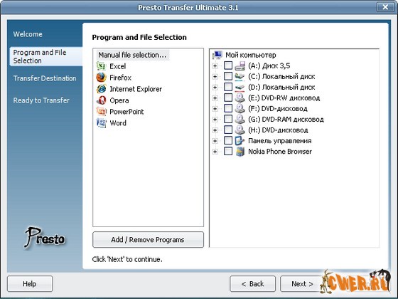 Presto Transfer Ultimate - приложение для автоматизации передачи ваших данных с одного компьютера на другой. Удобный в использовании интерфейс программы создает самораспаковывающийся архив ваших данных, для восстановления которых нужно просто запустить архив на компьютере получателя. Архив можно автоматически записать на CD/DVD, на MP3-плеер через USB, на съемные носители или переслать на удаленный FTP сервер. Вы можете выбрать вручную папки, диски или файлы для копирования или же быстро выбрать и передать данные из множества программ, включая такие программы, как Word, Access, Excel, Photoshop, PowerPoint, Opera, Firefox, Internet Explorer, Outlook, Skype и другие. Интерфейс программы выполнен в виде пошагового Мастера.
