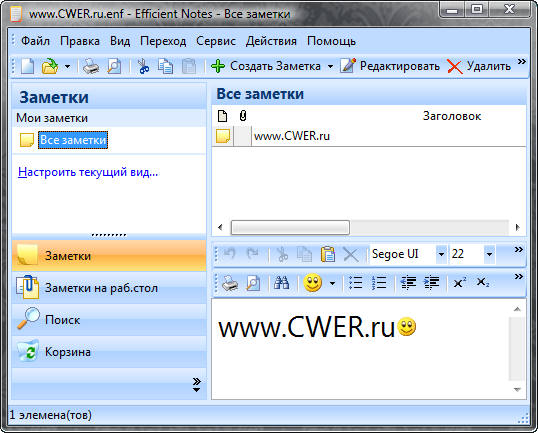 Efficient Notes - это элегантная, простая в использовании записная книжка ориентированная на Ноутбук. С Efficient Notes вы легко манипулировать своими записями, примечаниями и "липкими листочками" в одном интерфейсе и одном файле. Для этого Efficient Notes обладает необходимыми уникальными мощными инструментами: полнотекстовым поиском; мощным текстовым редактором сродни Microsoft Word с возможностями вставки различных элементов в виде таблиц, изображений, смайликов, интернет ссылок и даже добавить фоновый цвет или фоновое изображение. Программа интегрируется и при необходимости выводит на экран липкие листочки напоминания. Само собой Ваша частная информация полностью защищена паролем входа в программу и шифрованием необратимым алгоритмом SHA, включая файл сохранения. С Efficient Notes, посетившее Вас вдохновение, прекрасные идеи и события никогда не пройдут незамеченно!
