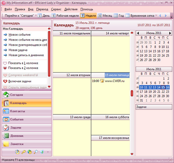 Efficient Lady's Organizer — это продвинутый и мощный персональный информационный менеджер, разработанный специально для женщин. Эта утилита поможет Вам организовать и спланировать Вашу работу и личную жизнь. Это планировщик, адресная книга, менеджер паролей и закладок, записная книжка и календарь событий, объединенные в одну мощную и удобную программу.
