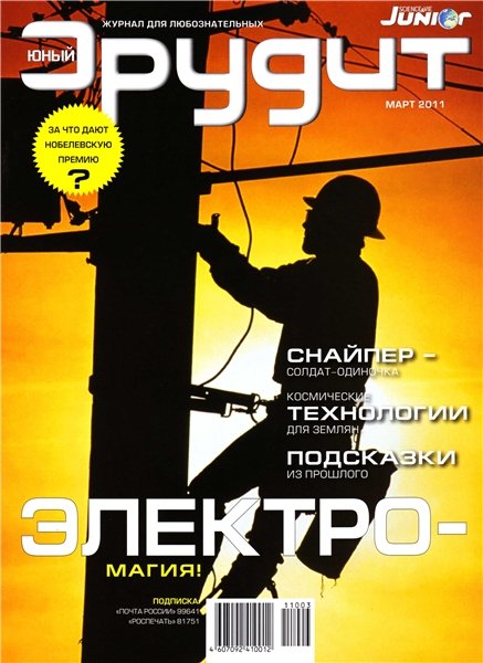 Ежемесячный журнал «Юный эрудит» адресован детям и подросткам. В занимательной форме журнал расскажет любознательным читателям об истории и сегодняшнем дне науки и техники, выдающихся ученых и первооткрывателях. Ребята узнают, как устроены машины и механизмы, от чего возникают смерчи и циклоны, что вызывает землетрясения и извержения вулканов. Специальные рубрики посвящены современным компьютерным и авиакосмическим технологиям, загадкам живой природы, прогнозированию будущего, истории оружия.