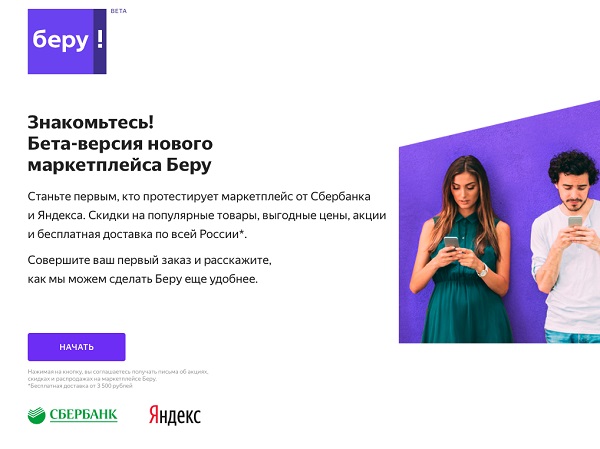 Сбербанк и Яндекс запустили бета-версию нового маркетплейса "Беру". Проект запущен после недавнего закрытия сделки по созданию совместного предприятия на базе Яндекс.Маркета. На данный момент доступно более 20000 товаров в категориях бытовая техника, электроника, компьютеры, товары для детей, косметика, товары для дома и дачи, товары для животных и красота и здоровье. Предусмотрены акции и скидки, персональные рекомендации, поиск товаров с различными фильтрами.