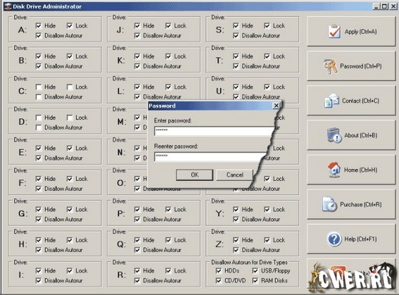 Disk Drive Administrator - программа для скрытия, блокировки и защиты ваших локальных, сетевых, USB-дисков, дискет, CD и DVD и отмены функции автозапуска для этих устройств. Disk Drive Administrator имеет интуитивно понятный интерфейс: вам всего лишь нужно отметить чекбоксами, что вы хотите сделать с тем или иным диском: скрыть, заблокировать доступ или отключить автозапуск. На саму программу тоже можно поставить пароль, тем самым, закрыв к ней доступ сторонних пользователей. Пароль будет запрашиваться при каждом запуске программы.