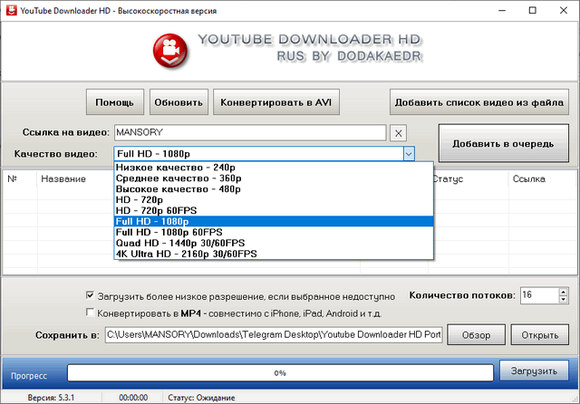 Youtube Downloader HD - бесплатный загрузчик видео. Легко загружайте видео и конвертируйте его в формат AVI или MP4 (совместимый с iPad, iPhone). Вы можете скачать видео высокого качества, видео высокой четкости и Full HD с YouTube.